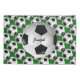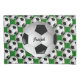 A football soccer ball design which is fully customisable with your own name or text. The background features a pattern of soccer balls on a football pitch green. Ideal for any soccer player, football coach or soccer fan.