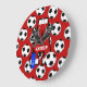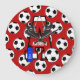 Treat the future soccer star in your life to one of these personalised monogram soccer Wall clocks. Featuring the Letter A with a template for the name to be added . Hanging from the letter A is a pair of soccer cleats, with a initialled water bottle and soccer ball either side. Background feature matching red as in the Initial and black and white soccer balls.