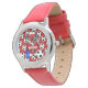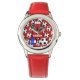 Treat the future soccer star in your life to one of these personalised monogram soccer watches. Featuring the Letter A with a template for the name to be added . Hanging from the letter A is a pair of soccer cleats, with a initialled water bottle and soccer ball either side. Background feature matching red as in the Initial and black and white soccer balls.