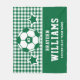 Personalised soccer themed fleece blanket for soccer players when they're not scoring goals on the field, and for their parents to support their kids and stay warm at chilly games! Makes a unique team gift for travel tournaments. Design features a soccer ball customised with the player's uniform number, custom text for the player's first and last name, and modern text for the football club team name. Stylish and modern design features sporty varsity jersey lettering and simple horizontal stripes with star accents. The colour scheme of green, and white gingham plaid can be modified to coordinate with your team colours.