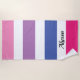 This stylish beach towel is decorated in bold stripes of pink, purple, blue and white with black typography.