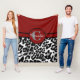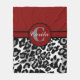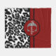 A leopard print fleece blanket with a modern look. The top of this design features a burgundy diagonal striped pattern and a black and white leopard print on the bottom. In the centre, there is a circle monogram logo which can be personalised with the recipient's initial and first name. Three sizes available.