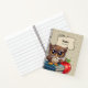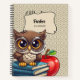 This lined notebook cover features a golden pattern background, adorned with a book owl and apple illustration, perfect for back to school. With a dedicated space for your kid's name and grade, this is truly a one of a kind school supply.
