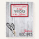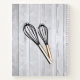 This fun rustic recipe notebook has red and black typography that says "Don't be afraid to take whisks in the Kitchen", bordered in a red and black trim. There are a pair of whisks at the bottom against a rustic, faded wood background. The lower right corner says Recipes and you personalise it right above that with your name.