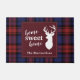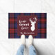 Cute home sweet home Christmas door mat you can easily customise by clicking the "Personalise" button, Featuring deer silhouette and clan MacLachlan tartan in red, and purple check.