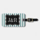 Personalised teal and white striped luggage tag. Elegant style. Classy teal blue stripe design with white monogrammed name intitial letters of couple. Great gift idea for husband and wife, married couples and newly weds going on honeymoon. Cute 3 letter monogram with striped pattern. Customisable background colour.