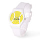Personalised tennis ball watches with custom name. Sporty pink or white bands. Cute gift idea for tennis lovers.