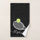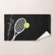 Personalised tennis towel with a simple tennis racket graphic and custom name or text and modern pretty script font monogram in black and white. Great gift for a women or girl tennis player with a feminine and girly look with a modern and minimal design on a useful tennis themed gift.