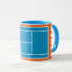 Creative tennis player gift mug featuring tennis balls on blue and orange tennis court. To personalise edit text to add his or her name.
