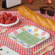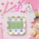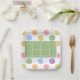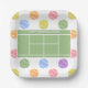 Creative tennis themed party or event plates featuring tennis court art and colourful tennis balls pattern. To customise edit text to add name.