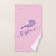 Personalised tennis towel with a simple cute tennis racket graphic and custom name or text in a feminine girly and modern pretty script font monogram. Any girls or womens tennis player would appreciate the elegant look on this modern and minimal useful tennis themed gift.