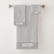 Name on light silver grey Bath Towel Set. Text can be personalised. Text only on one side.