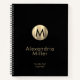 Modern to-do list journal features an elegant monogrammed design on rich black background. Custom monogram initial and name in stylish simple font with a complimentary brushed metallic gold monogram medallion.
