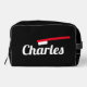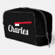 Personalised toiletry bag with red toothbrush logo. Custom travel Dopp kit design with script typography.