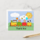 Adorable postcard, ideal for a child featuring a colourful cartoon toy train , travelling on the train are two friends and their dog. Each child has a balloon. A happy yellow sun peeking out from behind some fluffy white clouds smiling down on the scene. Two happy bumble bees are following the train. Below is a template to add your name or message to personalise.