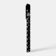 This smart iPhone case can be personalised with your chosen initials. The design has a repeating pattern of stars and sports trophies on a black background.