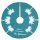 Personalised tropical Christmas tree skirt with palm trees. Turquoise blue or custom colour background. Elegant xmas Holiday decorations for warm exotic location near the beach or ocean. Add your own custom family name and seasons greetings like Merry Christmas, Mele Kalikimaka or Happy Holidays! Trendy x-mas accessories and home decor for home or office.