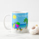 Personalised Beach Tropical Coffee Mugs with 2 Text Boxes for Your Name, City, State, Your Message or Delete any or all text. Bright and sunny beach themed coffee mugs will absolutely delight your friends when they see their Name on the right, front side and special message on the back left side of the beach mugs. CALL Linda to put any parts of this design on any gift. For design Changes and HELP, Call Linda: 239-949-9090