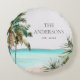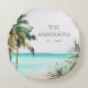 Add a tropical touch to your beach house decor with this personalised round pillow! Featuring watercolor palm trees, a blue beach scene, and summer coastal vibes.