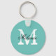Personalised turquoise blue name monogram keychain. Vintage initial letter with elegant script typography. Cute favour gift idea for trendy women and girls. Make your own monogrammed present for stylish wedding, bridal shower, bachelorette, girls weekend, engagement, anniversary, birthday etc. Fun for bride to be, bridesmaid, maid of honour, flower girl, mother of the bride, mother of the groom etc. Aqua and white.