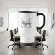 Personalised name typography monogram coffee to go travel mug. Vintage monogrammed coffeemug with stylish script letters. Cute custom birthday or wedding favour gift idea for men and women (his and hers). Stylish cup with elegant black and white colours. Available as big extra large oversized jumbo mug and to go travelmug. Double sided design.