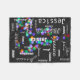 Personalised name subway art Christmas blanket- Holiday theme background photo of bright, multicolored Christmas bokeh lights in blue, orange, red, purple, and teal green on black background. Allover typography print of personalised name in several different white lettering styles. Cute Christmas baby shower gift or Christmas gift for a teen girl.