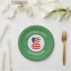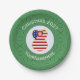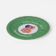 Paper party plates show a red haired angel wearing the flag of the United States of America for holiday party decorating or Christmas decor. The USA Flag Christmas angel is found inside a white, fractal circle of squiggly squares. The background is a green fractal squiggly squares. Add your own text or personalise with a name and the year.