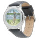 Vintage looking golfer in early 20th century attire taking a swing of his golf club on a watercolour landcaspe . Ideal gift for the golf fanatic or golfer in your life