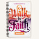 A watercolor illustration with the text "Walk by Faith" in an elegant, bold calligraphy style. The text is written in orange, pink, and purple hues. There is a faint silhouette of mountains in the background, providing a grounding effect. The overall image has a warm, sunset-like colour palette. personalised with name.