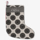 Deep, rich mocha brown symmetrical coin shapes create a modern repeat pattern on a taupe grey background. An elegant Christmas stocking that can be personalised with a name.