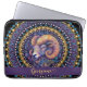 Protect your device with style using this Personalised Whimsical Aries Zodiac Dot Mandala laptop sleeve. This beautifully designed sleeve showcases an intricate mandala centred around a striking stylised ram’s head, capturing the bold and adventurous energy of Aries. The ram is adorned with detailed spiralling horns and swirling patterns, set against a rich colour palette of purples, blues, and golden hues that bring depth and vibrancy to the design. Encircling the ram is a concentric arrangement of decorative arcs, filled with petal-like and teardrop shapes reminiscent of traditional mandala art, lending an air of elegance and symmetry. Crafted for both protection and aesthetic appeal, this customisable laptop sleeve is perfect for anyone who wants to make a statement while safeguarding their tech. Personalise it with your name for a one-of-a-kind accessory that blends functionality with artistic beauty.