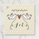 An illustration of 2 beautiful doves holding flowing ribbon with a love heart attached.