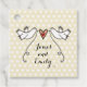An illustration of 2 beautiful doves holding flowing ribbon with a love heart attached.