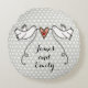 An illustration of 2 beautiful doves holding flowing ribbon with a love heart attached.
