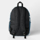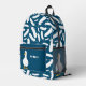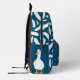 This personalised backpack's just ducky! It features a simple, realistic style illustration of a white duck with orange bill and feet set against a navy blue background with your own name or short message in white lettering on the front pocket. There are a couple of more ducks on the side panels and the rest of the bag has a pattern of white feathers against a blue background.