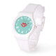 Personalised modern stylish light teal, white and red wristwatch design with the owner's first and last name.