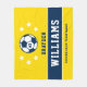 Personalised soccer themed fleece blanket for soccer players when they're not scoring goals on the field, and for their parents to support their kids and stay warm at chilly games! Makes a unique team gift for travel tournaments. Design features a soccer ball customised with the player's uniform number, custom text for the player's first and last name, and modern text for the soccer club team name. Stylish and modern design features sporty varsity jersey lettering and simple horizontal stripes with star accents. The colour scheme of yellow, navy blue, and white can be modified to coordinate with your team colours.