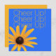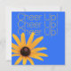 The artwork features a macro photograph of the bright sun yellow petals of a black-eyed Susan flower, which is said to provoke happiness, optimism, and positivity. The flower is presented on a blue background with elegant typography repeats that read "Cheer Up!" Personalise this cheer up card or purchase as is.