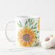 This unique mug is decorated with yellow watercolor sunflowers and green leaves are on a white background.