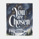 A watercolor painting of a navy blue night sky with stars. The text "You Are Chosen" is written in elegant, bold calligraphy style. There are subtle gold accents and framing around the text and the sky. The background is a serene landscape with mountains and trees.. personalised with name.