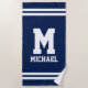 Personalises name monogram navy blue and white stripe beach towel. Personalised beach towel with bold athletic typography. Cool outdoor summer accessories for beach, travel or pool. Customisable colours. Perfect for Father's Day or Birthday! Make one for best dad, world's greatest father, son, brother, friend, grandpa, boyfriend, co worker, sister, daughter etc.