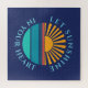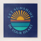 A round photo template on a dark blue background. Click personalise to change the sunset to your own image, and the text to your own, or buy it as is.