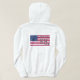 Stay warm while showcasing your national pride with this custom hoodie featuring a bold USA soccer design on the back. This high-quality hooded sweatshirt is perfect for cool game days or casual everyday wear, offering a comfortable fit for dedicated fans. The back features a vibrant stars and stripes background, personalized with your custom name and jersey number. A crisp white outline ensures the text is perfectly readable against the red and white stripes. Complete with a dynamic soccer player silhouette and "USA!" typography, it is a spirited and functional way to represent your team.