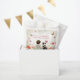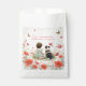 Girl's baby shower favor bags. Sweet baby girl sitting next to her little puppy dog in a patch of pretty watercolor flowers. There is a sweet sentimental poem on it about a baby girl and a puppy starting their life together. Sage green and red wildflowers and butterflies background.