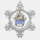 Pretty snowflake shaped ornament features a stick figure bride and groom in the wedding car in front of a decorated holiday tree. Text reads Just Married! You can add your own holiday message or names easily before ordering.
