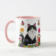 A sweet personalized coffee cup with a cute illustration of a black and white cat surrounded by flowers and butterflies in a paper quilling impasto style.