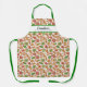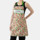 Gingerbread cookies in the shape of people, mittens, houses, candy canes and more decorate the background of this apron. There is a white box with green borders and inside that box you can add your personalization. Change the name, the words