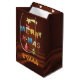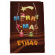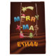 A personalized gift bag for Christmas with lots of candy and chocolate as a background