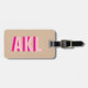 This luggage tag features a shadow-style monogram and hot pink, light pink, and beige tones. The color combination creates a soft, preppy look while keeping the tag easy to spot on bags. It includes space for contact information and an adjustable strap for attaching to luggage.