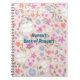 Personalized floral notebook, with spiral bound pages. Add a title in teal blue script over a full page of ditsy, multi-color, hand-drawn flowers on a blush background. No AI or purchased elements. The design pops off the cover. Perfect to customize for any woman, with any title, for any occasion. Pastel flowers are pink, coral orange, blue, off-white and green stems.